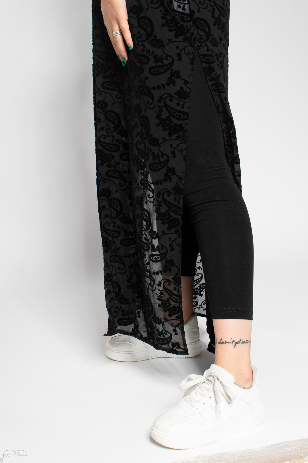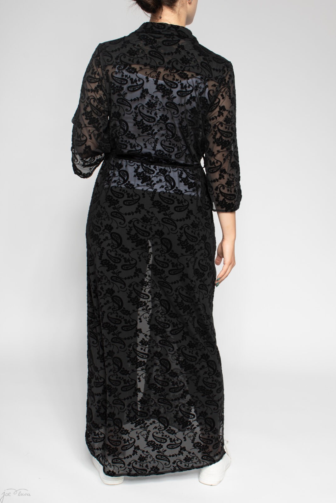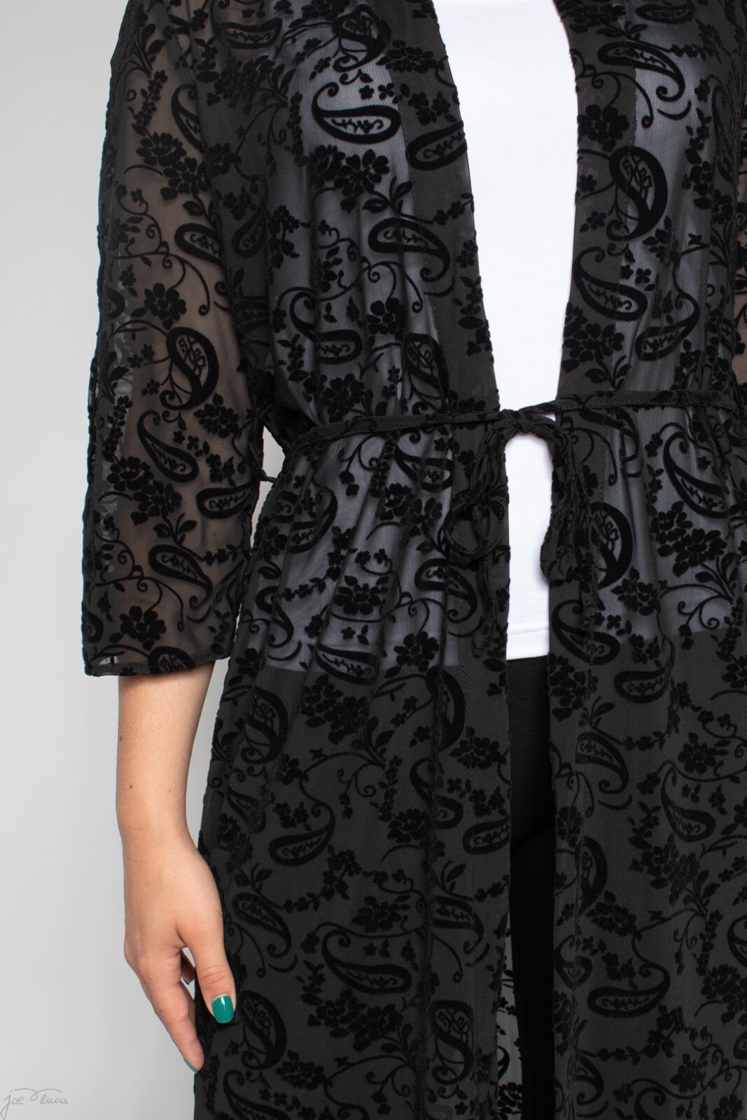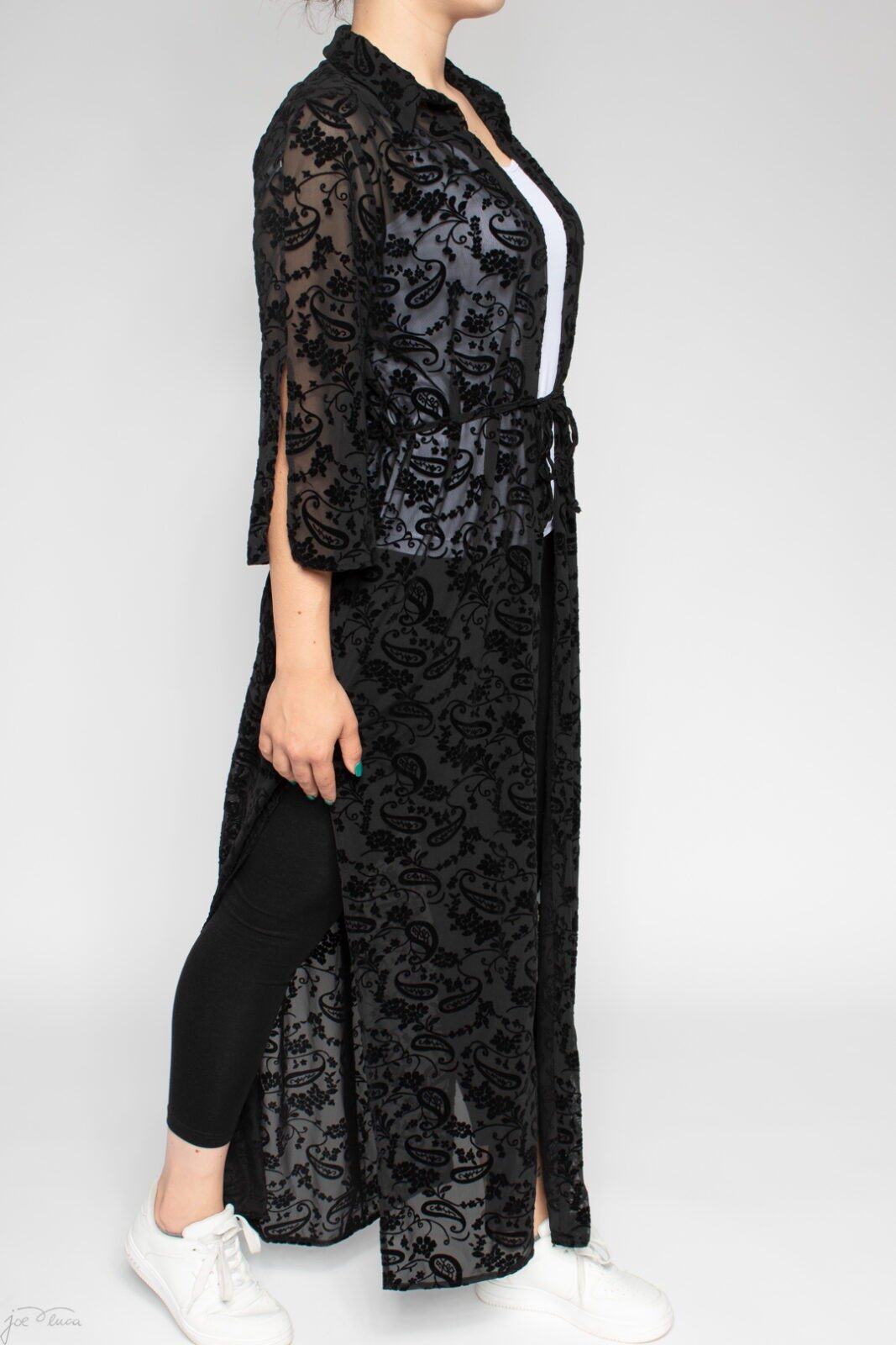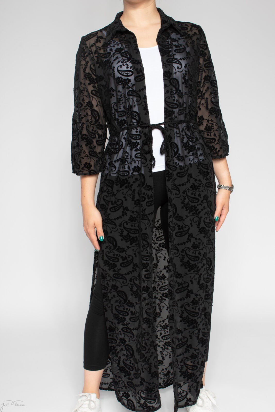 Duži moderni kaputić Jasmine u crnoj boji, u potpunosti izrađen od čipke. Kaputić ima izreze na rukavima i na donjoj strani te je dodan pojas kojim ga možete prilagoditi. Možete ga kombinirati s dnevnim outfitom ili s kupaćim kostimom. Sastav: 95% poliester, 5% elastan.
