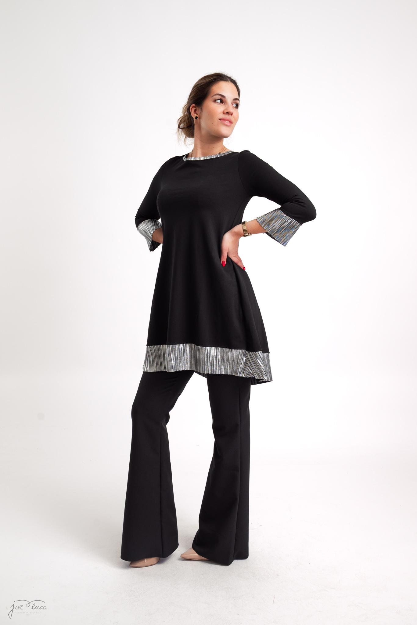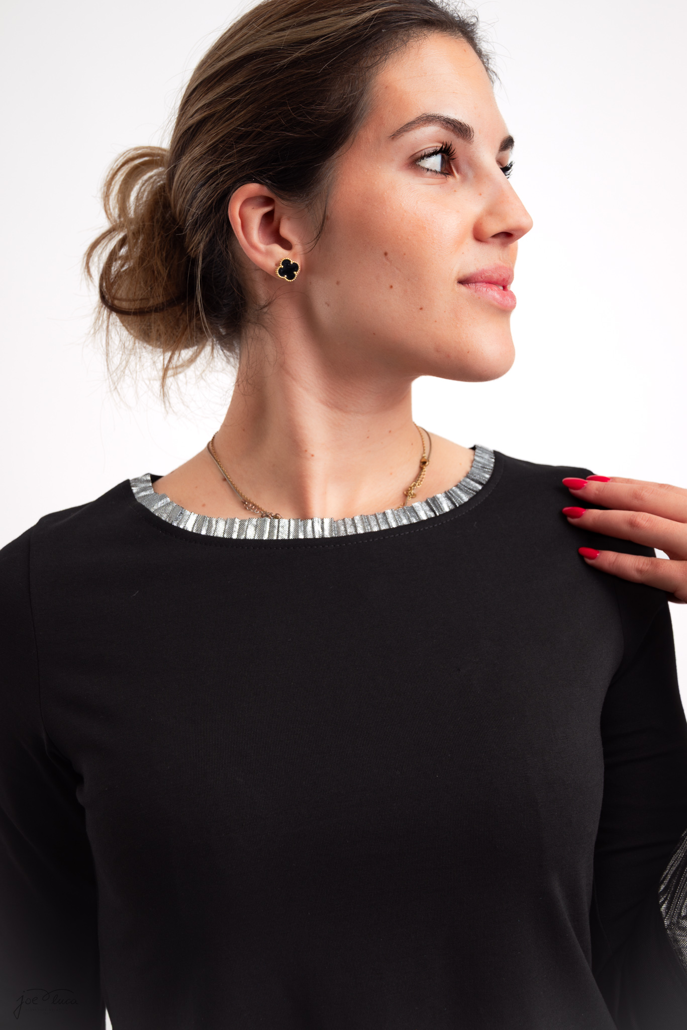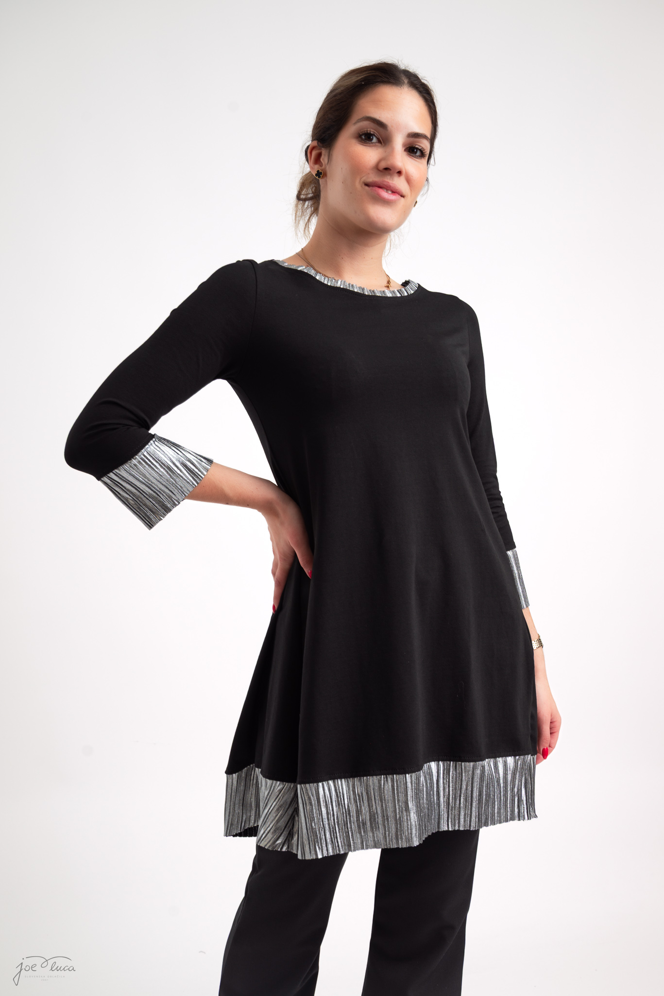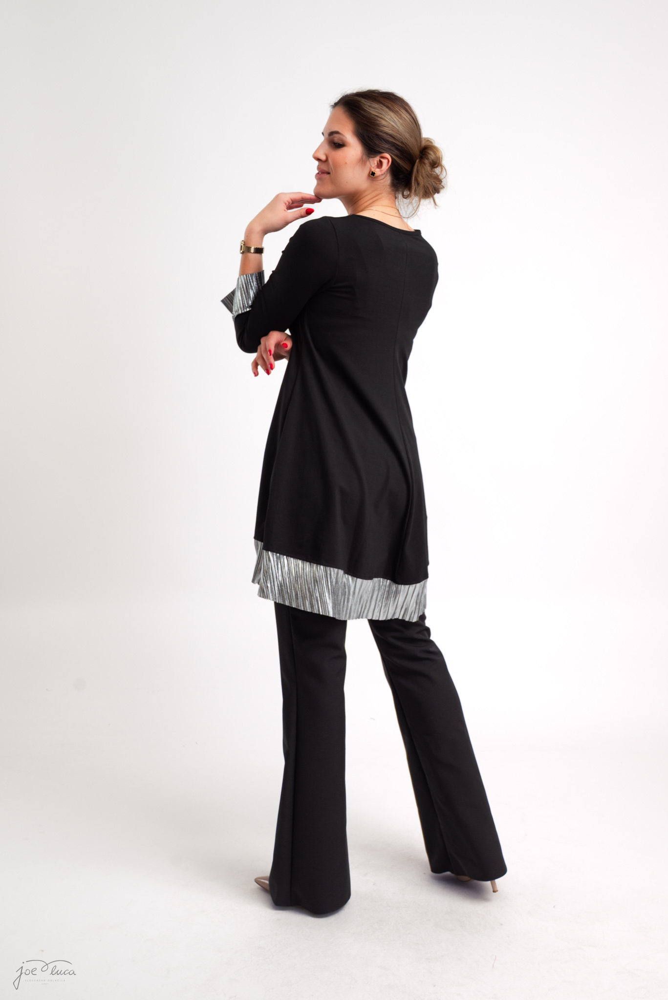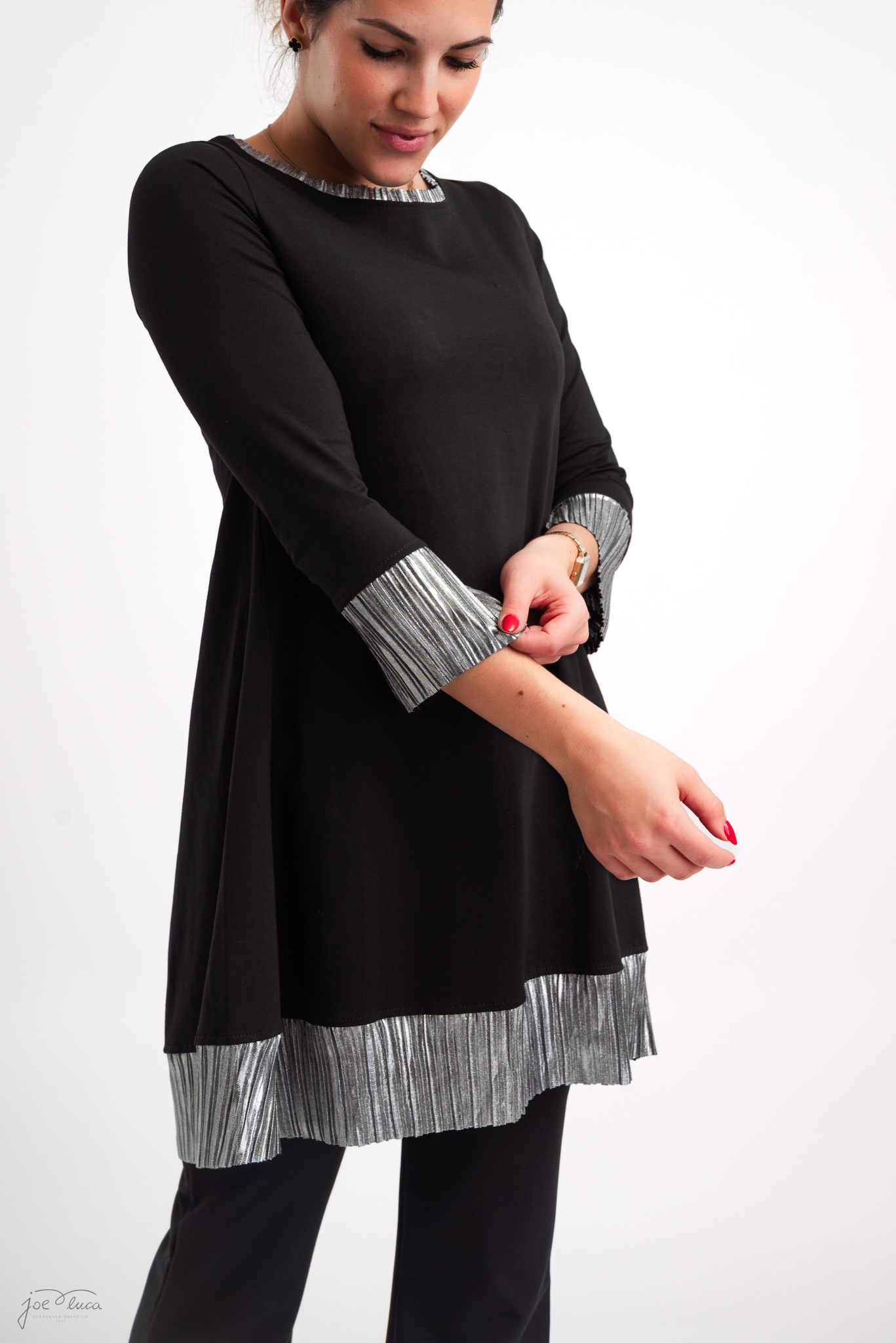 • Srebrni plisirani detalji na ovratniku, rukavima i donjem rubu za dašak glamura